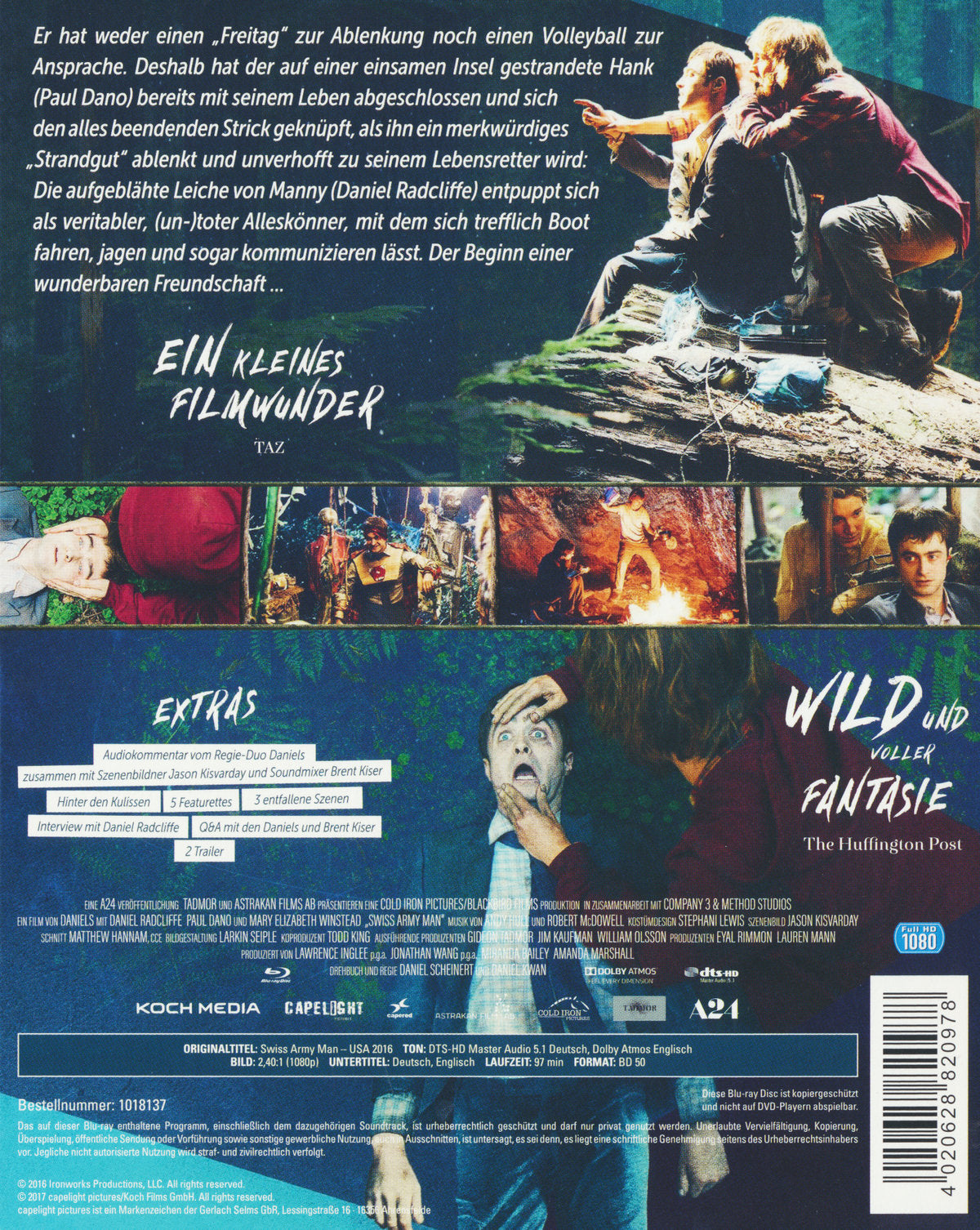 "Kurios", "Crazy", "Albern" - übereinstimmend ist SWISS ARMY MAN ein absolutes Filmunikat, das den Zuschauer mit seiner einzigartigen und charmanten Mischung aus Feel Good und tiefen Gedanken in seinen Bann zieht. Paul Dano und Daniel Radcliffe geben alles - im wahrscheinlich lebhaftesten Film um einen Leblosen, den sie je sehen werden.