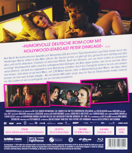 Null Bock auf Versicherung! Alexandra ist 25, hat ihre Ausbildung zur Versicherungskauffrau abgebrochen und weiß nicht „was nun“. Kurzentschlossen bewirbt sie sich bei einem Taxiunternehmen, macht den Taxischein und fährt fortan durch die Hamburger Nacht, mitten in den 80er Jahren: Der Sound ist hart, die Kneipen dunkel, es gibt viel Sex, geraucht wird ständig und über alles und nichts diskutiert. Wer Gefühl zeigt, hat verloren. Coolsein ist allererste Pflicht. Wie gut, dass die Fahrgäste am Ende der Fahrt aussteigen und Alex wieder alleine ist mit sich und der Nacht. Da nervt weder die übereifrige Mutter, noch der besserwisserische Yuppie-Bruder samt Popper-Clique. Doch der Versuch, sich vor dem eigenen Leben zu verstecken, misslingt. Verantwortlich dafür sind ihre selbstgerechten Kollegen: eine Gruppe verkrachter Studenten, die Alex sagen wollen, wie sie zu sein hat. Allen voran Dietrich, der gutaussehende Kollege mit dem sie in eine Beziehung schlittert ohne es wirklich zu wollen. Auch ihre oft mehr als merkwürdigen Fahrgäste fordern sie ein ums andere mal heraus. Und dann ist da noch die unerschütterliche Liebe von Marc, einem 1,35 Meter kleinen, aber in Wirklichkeit großen Mann, der Alex näher kommt als ihre konsequent nach außen getragene raue Schale tatsächlich erlaubt…
