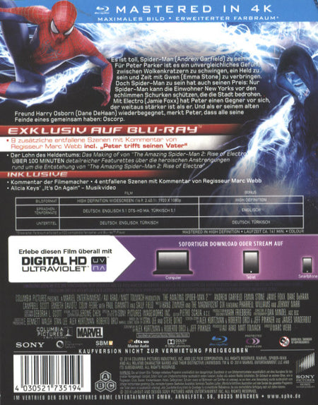 Enthält: Kommentar der Filmemacher; 4 entfallene Szenen mit Kommentar von Regisseur Marc Webb; Alicia Keys "It's On Again" - Musikvideo; 9 entfallene Szenen; Making of: Der Lohn des Heldentums; Über 100 Minuten detailreicher Featurettes; 4K Mastered;