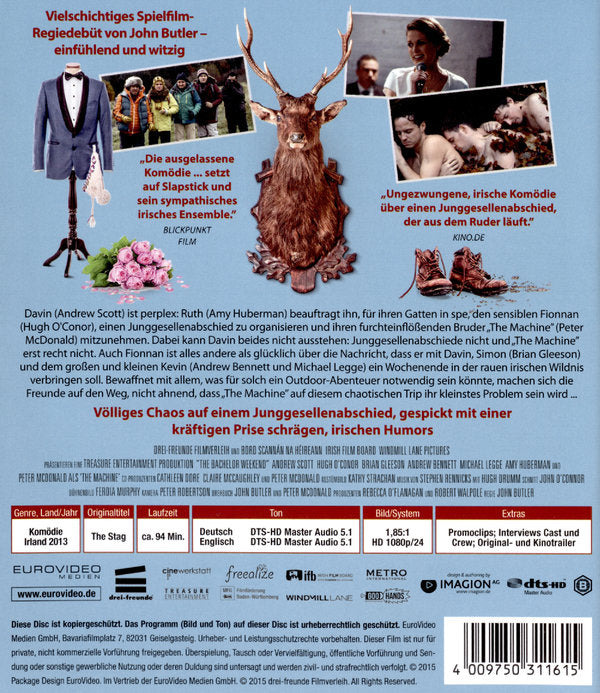 Davin ist perplex: Ruth beauftragt ihn, für ihren Gatten in spe, den sensiblen Fionnan, einen Junggesellenabschied zu organisieren und ihren furchteinflößenden Bruder „The Machine“ mitzunehmen. Dabei kann Davin beides nicht ausstehen: Junggesellenabschiede nicht und „The Machine“ erst Recht nicht. Auch Fionnan ist alles andere als glücklich über die Nachricht, dass er mit Davin, Simon und dem großen und kleinen Kevin ein Wochenende in der rauen irischen Wildnis verbringen soll. Doch bewaffnet mit allem, was für so einen Outdoor-Trip notwendig ist, machen sich die Freunde auf den Weg, nicht ahnend, dass „The Machine“ ihr kleinstes Problem sein wird…