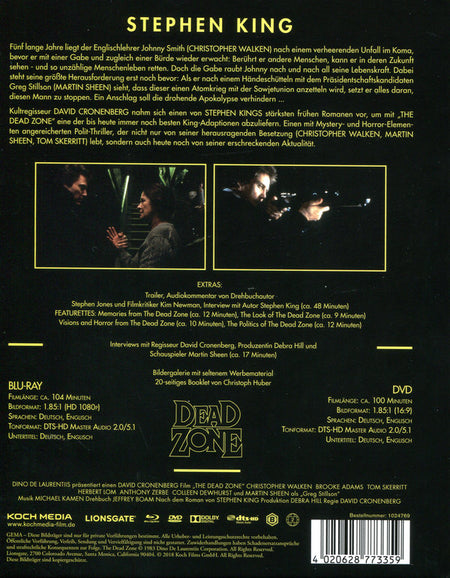 Kultregisseur David Cronenberg nahm sich einen von Stephen Kings stärksten frühen Romanen vor, um mit "The Dead Zone" eine der bis heute immer noch besten King-Adaptionen abzuliefern. Einen mit Mystery- und Horror-Elementen angereicherten Polit-Thriller, der nicht nur von seiner herausragenden Besetzung (Christopher Walken, Martin Sheen, Tom Skerritt) lebt, sondern auch heute noch von seiner furchteinflößenden Aktualität. Ein Genre-Klassiker, den Koch Films im Rahmen dieser Mediabook-Edition erstmals auch auf Blu-ray zur Veröffentlichung bringt.