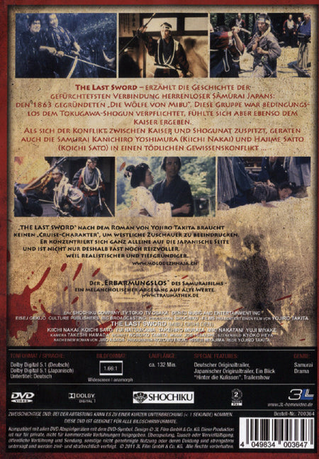 The Last Sword erzählt in epischen Bildern die Geschichte der gefürchtesten Verbindung herrenloser Samurai Japans: den 1863 gegründeten "Shinzengummi, die im Volksmund auch "Die Wölfe von Mibu" genannt wurden. Diese Gruppe war bedingungslos dem Tokugawa-Shogun verpflichtet, fühlte sich aber ebenso dem Kaiser ergeben. Als der Konflikt zwischen Kaiser und Shogunat prekärer wird, geraten auch die Samurai Kainchiro Yoshimura und Hajime Saito in den Strudel der Ereignisse...