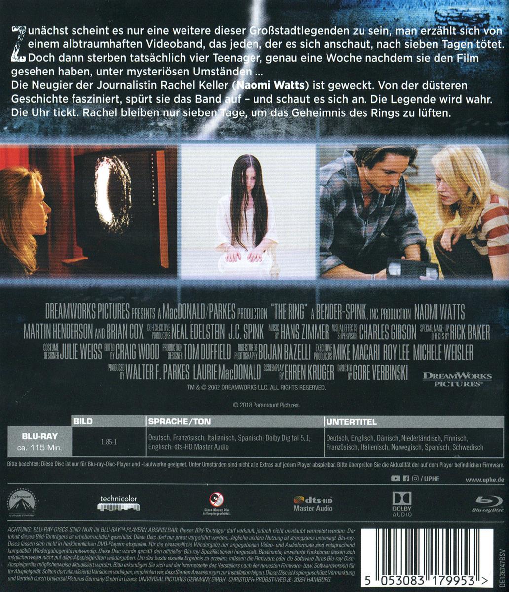 Zun�chst scheint es nur eine weitere dieser Gro�stadtlegenden zu sein, man erz�hlt sich von einem albtraumhaften Videoband, das jeden, der es sieht, nach sieben Tagen t�tet. Doch dann sterben tats�chlich vier Teenager, genau eine Woche nachdem sie das Band gesehen haben, unter mysteri�sen Umst�nden ...Die Neugier der Journalistin Rachel Keller (Naomi Watts) ist geweckt. Von der d�steren Geschichte fasziniert, sp�rt sie das Band auf - und schaut es sich an. Die Legende wird wahr. Die Uhr tickt. Rachel bleiben nur sieben Tage, um das Geheimnis des Rings zu l�ften.