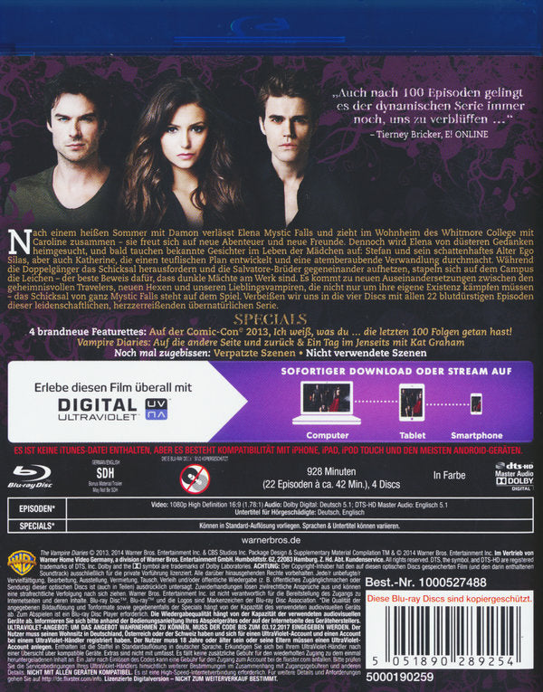 In der turbulenten Staffel 4 wurde Mystic Falls auf den Kopf gestellt, als der schlimmste Albtraum der schönen und leidenschaftlichen Elena Gilbert Wirklichkeit wurde - das Leben als Vampir. Während Elena sich mit ihren neuen Fähigkeiten und ihrem unbezähmbaren Blutdurst arrangieren musste, erfuhren die in Elena verliebten Vampirbrüder Damon und Stefan Salvatore die erstaunliche Neuigkeit, dass es eine Heilmethode für den Vampirismus geben könnte. Die Suche nach dem Heilmittel führt die Brüder zusammen mit Elenas Bruder und ihren Freundinnen Bonnie und Caroline zur grausigen Konfrontation mit dem uralten, allmächtigen Unsterblichen Silas, der vor über 2000 Jahren zusammen mit dem Heilmittel begraben wurde. Doch Elena ist nicht der einzige Vampir, der auf die Rückkehr ins Menschenleben hofft. Wer das Heilmittel letztlich an sich bringt, wird im atemberaubenden Staffelfinale geklärt. Hinzu kommen Momente unerwarteter Freude, unaussprechlichen Leids und ein ernsthaftes Liebesgeständnis.