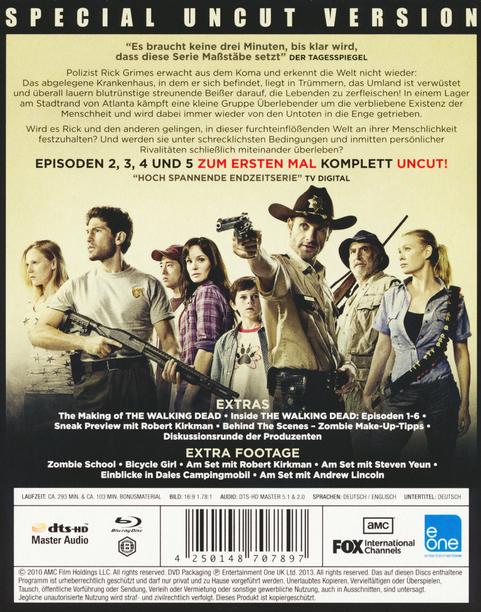 Enthält: Laufzeit Bonusmaterial ca. 103 Min.; The Making of The Walking Dead; Inside "The Walking Dead": Episoden 1-6; Sneak Preview mit Robert Kirkman; Behind the Scenes - Zombie Make-Up-Tipps; Diskussionsrunde der Produzenten; Zombie School; Bicycle Girl; Am Set mit Robert Kirkman; Am Set mit Steven Yeun; Einblicke in Dales Campingmobil; Am Set mit Andrew Lincoln;