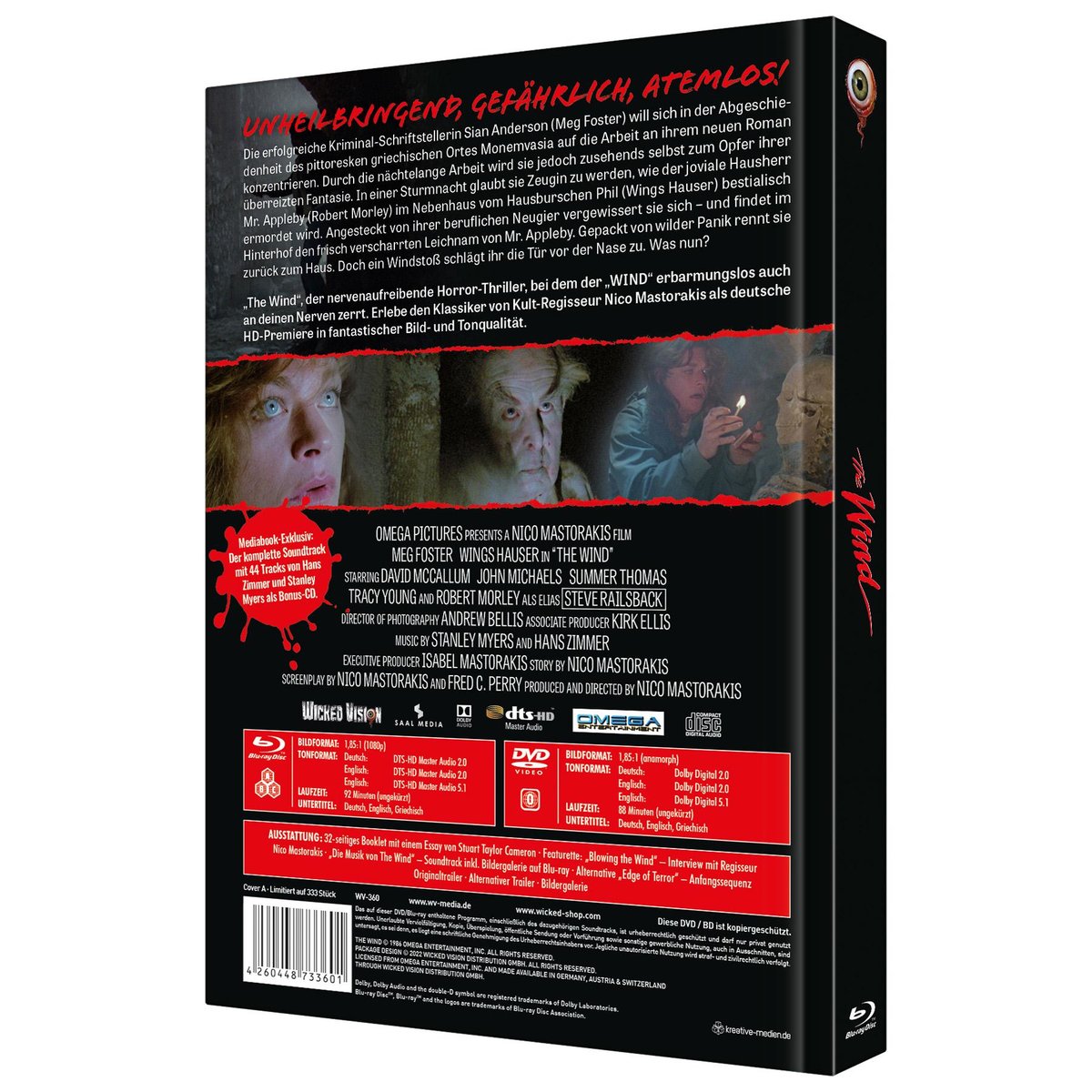 Enthält: - inkl. Sountdtrack CD; - 32-seitiges Booklet mit einem Essay von Stuart Taylor Cameron (Deutsch); - Featurette: „Blowing the Wind“ – Interview mit Regisseur Nico Mastorakis; - „Die Musik von The Wind“ – Soundtrack inkl. Bildergalerie auf Blu-ray; - Alternative „Edge of Terror“ – Anfangssequenz; - Originaltrailer; - Alternativer Trailer; - Bildergalerie; Laufzei DVD ca. 88 Minuten