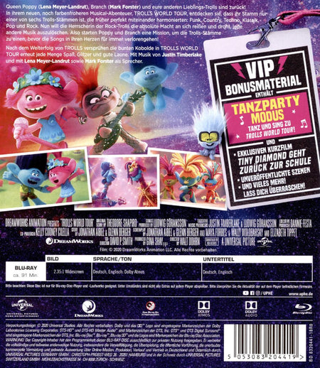 Tanz. Sing. Lach. Und nochmal!Queen Poppy (Lena Meyer-Landrut), Branch (Mark Forster) und eure anderen Lieblings-Trolls sind zurück! In ihrem neuen, noch farbenfroheren Musical-Abenteuer, "Trolls World Tour", entdecken sie, dass ihr Stamm nur einer von sechs Trolls-Stämmen ist, die früher perfekt miteinander harmonierten: Funk, Country, Techno, Klassik, Pop und Rock. Nun will die Herrscherin der Rock-Trolls die absolute Macht an sich reißen und droht, jede andere Musik auszulöschen. Also starten Poppy und Branch eine Mission, um die Trolls-Stämme zu einen, bevor die Songs in ihren Herzen für immer verlorengehen!Nach dem Welterfolg von "Trolls" versprühen die bunten Kobolde in "Trolls World Tour" erneut jede Menge Spaß, Glitzer und gute Laune. Mit Musik von Justin Timberlake und mit Lena Meyer-Landrut sowie Mark Forster als Sprecher.Der bunteste Spaß aller Zeiten