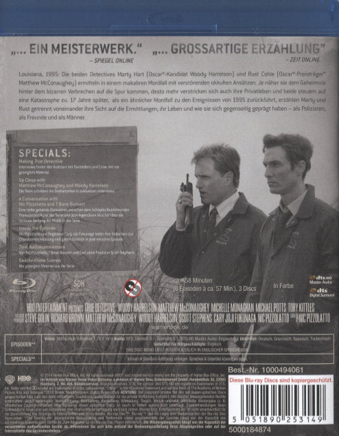 Enthält: Making True Detective Interviews hinter den Kulissen mit Darstellern und Crew, mit nie gezeigtem Material; Up Close with Matthew McConaughey and Woody Harrelson Die Stars schildern die Dreharbieten in exklusiven Interviews; A Conversation with Nic Pizzolatto and T Bone Burnett Eine tiefer gehende Diskussion zwischen dem Schöpfer/ausführenden Produzenten/Autoren der Serie und dem legendären Musiker über die zentrale Stellung der Musik innerhalb der Serie; Inside the Episode Nic Pizzolatto und Regisseur Cary Joji Fukunaga teilen ihre Gedanken zur Charakterentwicklung und geben Einblick in jede einzelne Episode; Zwei Audiokommentare Von Nic Pizzolatto, T Bone Burnett und Executive Producer Scott Stephens Geschnittene Szenen Nie gezeigtes Material aus der Serie; Geschnittene Szenen;