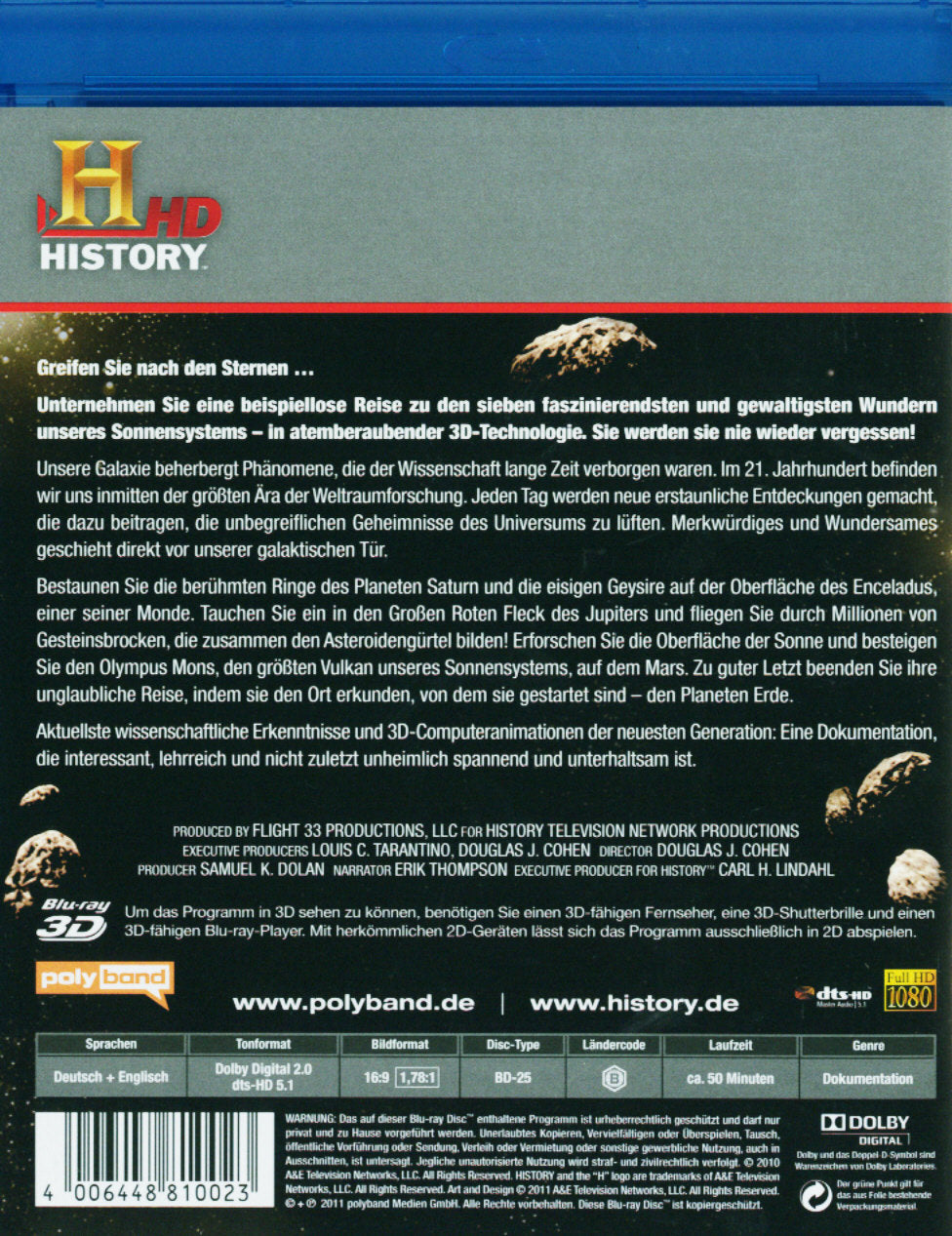 Schon immer waren die Menschen von den Sternen fasziniert. Seit jeher ging diese Faszination mit einer großen Leidenschaft für Technologie einher. Von den ersten Teleskopen, Sternwarten und astronomischen Bildern bis hin zu Satelliten, Weltraumstationen und dem Hubble-Weltraumteleskop – stets strebten wir danach, Geräte zu entwickeln, um die Weiten des nächtlichen Himmels zu erforschen. Und nun, mit der Entwicklung der 3D-Technologie, sind die Zuschauer endlich dazu eingeladen einen gigantischen Sprung in die Welt der Wunder, die jenseits unserer Erde liegt, zu unternehmen.Besuchen Sie die Ringe des Saturns, tauchen Sie in den großen Roten Fleck des Jupiters, erforschen Sie die Oberfläche der Sonne und fliegen Sie durch den Asteroidengürtel! Unternehmen Sie eine Reise zu den 7 Wundern des Sonnensystems. Sie werden sie nie wieder vergessen.Aktuellste wissenschaftliche Erkenntnisse und 3D-Computeranimationen der neuesten Generation: Eine Dokumentation, die interessant, lehrreich und nicht zuletzt unheimlich spannend und unterhaltsam ist!