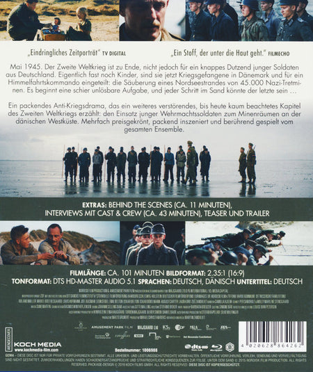 Mai 1945. Der Zweite Weltkrieg ist zu Ende, nicht jedoch für ein knappes Dutzend junger Soldaten aus Deutschland. Kurz zuvor waren sie für Hitlers letztes Aufgebot eingezogen worden, den Volkssturm. Sie sind noch fast Kinder, doch nun Kriegsgefangene in Dänemark und für ein Himmelfahrtskommando eingeteilt: die Säuberung eines Nordseestrandes von 45.000 Nazi-Tretminen. Weder ausgebildet noch ausgerüstet und völlig ohne technische Hilfsgeräte müssen sie sich Stück für Stück durch den Sand quälen. Wo die nächste Mine liegt, wo diese explodieren wird – ist ungewiss. Es beginnt eine schier unlösbare Aufgabe, jeder Schritt im Sand könnte der letzte sein. Das einzige, was ihren Lebenswillen erhält, ist die Hoffnung auf Freiheit. Diese hat ihnen ihr dänischer Kommandant Carl versprochen. Doch dann passiert ein schreckliches Unglück. Wird Carl nach wie vor zu seinem Wort stehen?