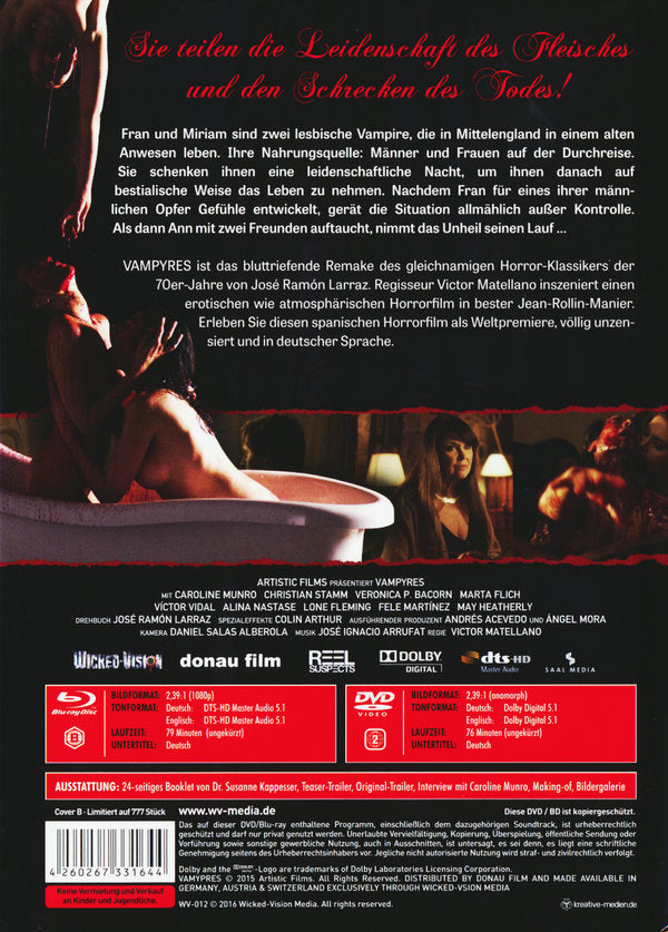 VAMPYRES erscheint als Weltpremiere, ungekürzt und in zwei Sprachfassungen. Eine ausländische Veröffentlichung gibt es bisher nicht nicht. Ausgeliefert wird diese ungekürzte Fassung in zwei Mediabook-Varianten, jeweils limitiert auf 555 Stück.