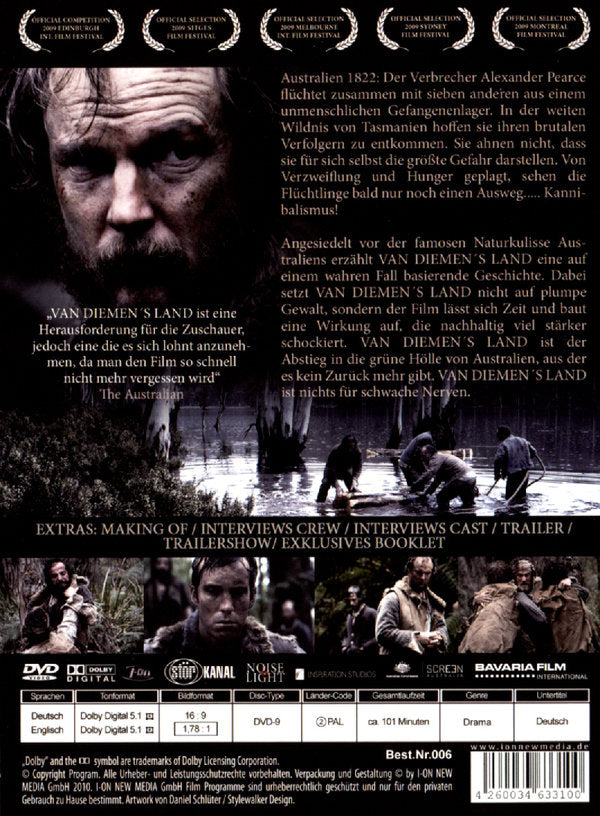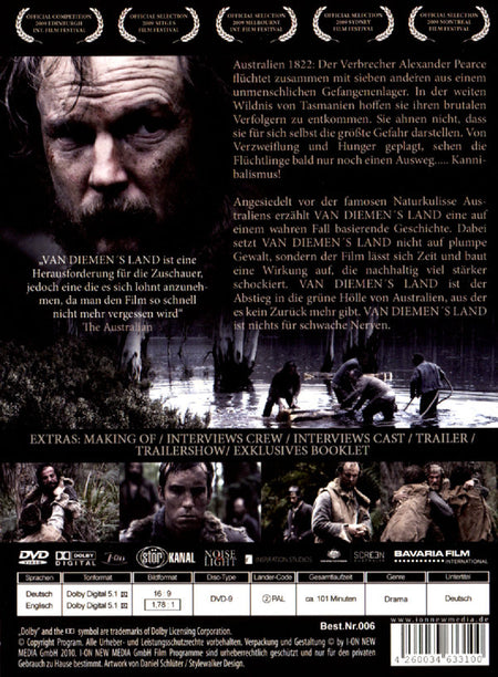 Australien 1822: Der Verbrecher Alexander Pearce fl�chtet zusammen mit sieben anderen aus einem unmenschlichen Gefangenenlager. In der weiten Wildnis von Tasmanien hoffen sie ihren brutalen Verfolgern zu entkommen. Sie ahnen nicht, dass sie f�r sich selbst die gr��te Gefahr darstellen. Von Verzweiflung und Hunger geplagt sehen die Fl�chtlinge bald nur noch einen Ausweg.....Kannibalismus! VAN DIEMEN�S LAND ist eine Herausforderung f�r die Zuschauer, jedoch eine die es sich lohnt anzunehmen, da man den Film so schnell nicht mehr vergessen wird.