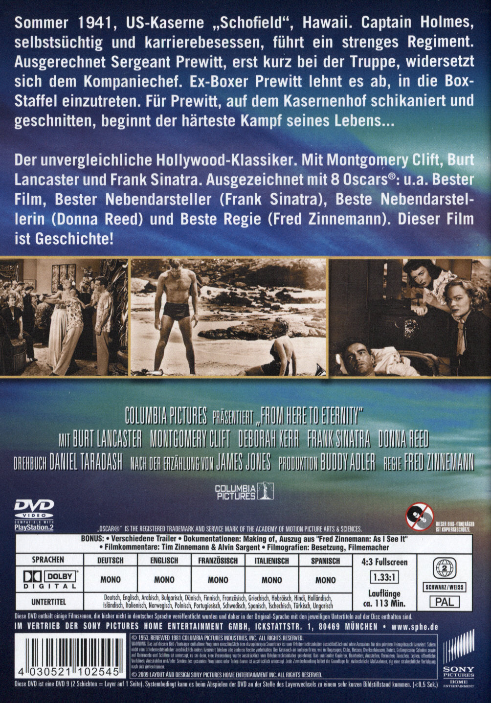 Verdammt in alle Ewigkeit. Der unvergleichliche Hollywood-Klassiker. Mit Montgomery Clift, Burt Lancaster und Frank Sinatra. Ausgezeichnet mit 8 Oscars: u.a. Bester Film, Bester Nebendarsteller, Beste Nebendarstellerin und Beste Regie. Dieser Film ist Geschichte!!