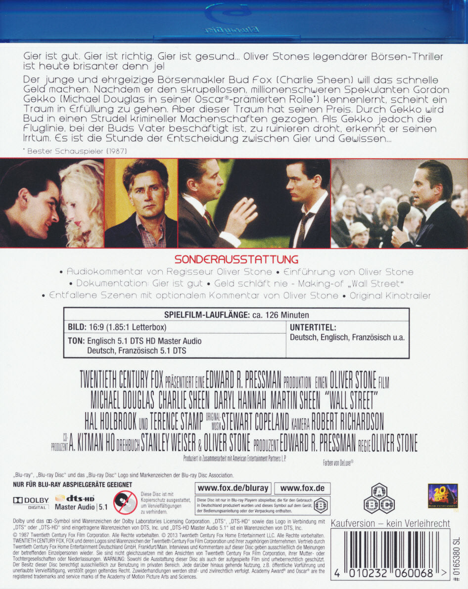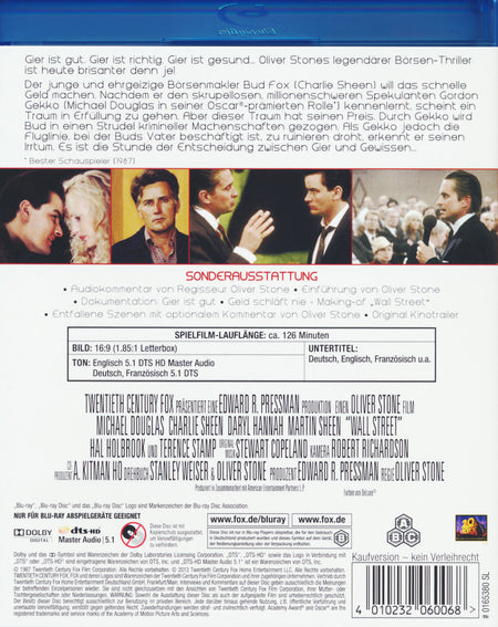 Enthält: Audikommentar von Regisseur Oliver Stone; Einführung von Oliver Stone; Dokumentation: Gier ist gut; Geld schläft nie - Making Of; Entfallene Szenen mit Kommentar von Oliver Stone; Original Kinotrailer;