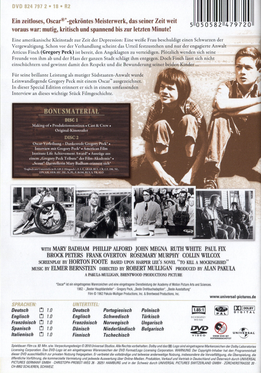 Enthält: Making Of; Produktionsnotizen; Cast & Crew; Original Kinotrailer; Oscar-Verleihung - Dankesrede Gregory Peck (OmU); Interview mit Gregory Peck (OmU); American Film Institute Life Achievement Award (OmU); Auszüge aus einem "Gregory Peck Tribute" der Film-Akademie (OmU); "Scout"-Darstellerin Mary Badham erinnert sich (OmU);