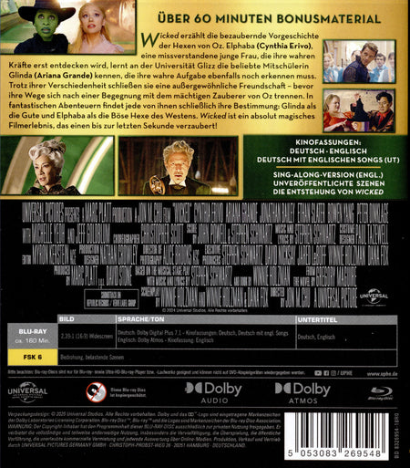 "Wicked" erzählt die bezaubernde Vorgeschichte der Hexen von Oz. Elphaba (Cynthia Erivo), eine missverstandene junge Frau, die ihre wahren Kräfte erst entdecken wird, lernt an der Universität Glizz die beliebte Mitschülerin Glinda (Ariana Grande) kennen, die ihre wahre Aufgabe ebenfalls noch erkennen muss. Trotz ihrer Verschiedenheit schließen sie eine außergewöhnliche Freundschaft - bevor ihre Wege sich nach einer Begegnung mit dem mächtigen Zauberer von Oz trennen. In fantastischen Abenteuern findet jede von ihnen schließlich ihre Bestimmung: Glinda als die Gute und Elphaba als die Böse Hexe des Westens. "Wicked" ist ein absolut magisches Filmerlebnis, das einen bis zur letzten Sekunde verzaubert!Die DVD und 4K UHD enthalten jeweils die deutsche und englische Kinofassung. Die Blu-ray enthält alle 3 Kinofassungen (Deutsch, Englisch, Deutsch mit englischen Songs und deutschen Untertiteln).
