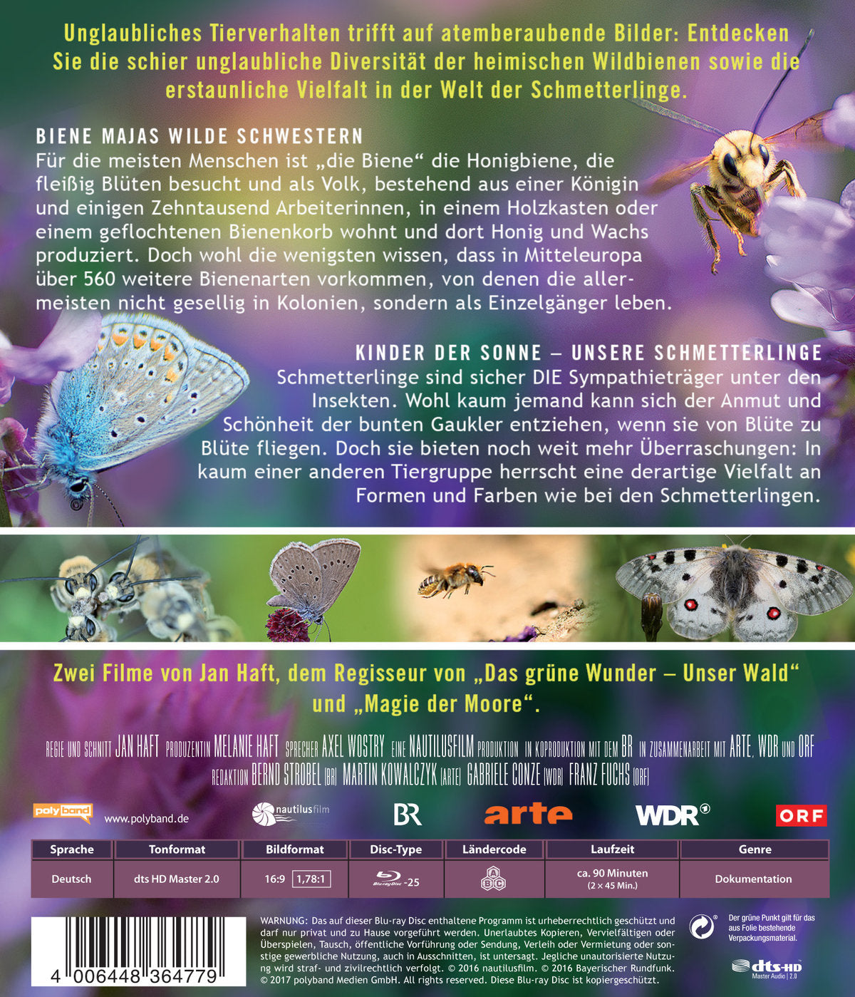 Jan Haft ("Das Gr�ne Wunder", "Magie der Moore") zeigt die schier unglaubliche Diversit�t der heimischen Wildbienen sowie die erstaunliche Vielfalt in der Welt der Schmetterlinge.