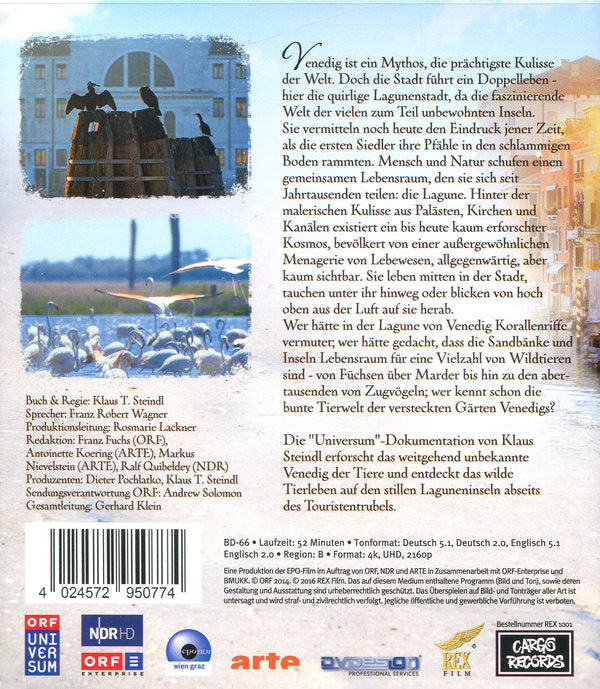 Venedig ist ein Mythos, die prächtigste Kulisse der Welt. Doch die Stadt führt ein Doppelleben - hier die quirlige Lagunenstadt, da die faszinierende Welt der vielen zum Teil unbewohnten Inseln. Sie vermitteln noch heute den Eindruck jener Zeit, als die ersten Siedler ihre Pfähle in den schlammigen Boden rammten. Mensch und Natur schufen einen gemeinsamen Lebensraum, den sie sich seit Jahrtausenden teilen: die Lagune. Hinter der malerischen Kulisse aus Palästen, Kirchen und Kanälen existiert ein bis heute kaum erforschter Kosmos, bevölkert von einer außergewöhnlichen Menagerie von Lebewesen, allgegenwärtig, aber kaum sichtbar. Sie leben mitten in der Stadt, tauchen unter ihr hinweg oder blicken von hoch oben aus der Luft auf sie herab. Wer hätte in der Lagune von Venedig Korallenriffe vermutet; wer hätte gedacht, dass die Sandbänke und Inseln Lebensraum für eine Vielzahl von Wildtieren sind - von Füchsen über Marder bis hin zu den abertausenden von Zugvögeln; wer kennt schon die bunte Tierwelt der versteckten Gärten Venedigs?