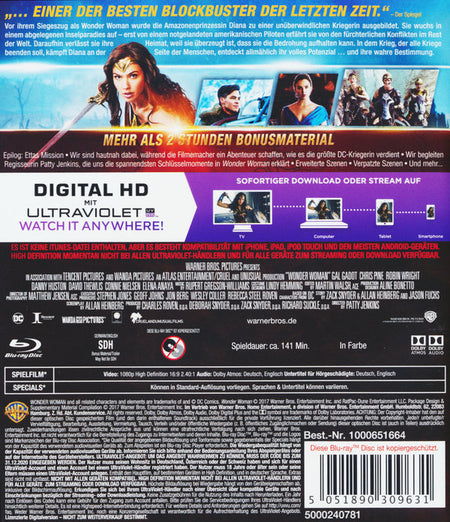 Enthält: Epilog: Ettas Mission; Wir sind hautnah dabei, während die Filmemacher ein Abenteuer schaffen, wie es die größte DC-Kriegerin verdient; Wir begleiten Regisseurin Patty Jenkins, die uns die spannendsten Schlüsselmomente in Wonder Women erklärt; Erweiterte Szenen; Verpatzte Szenen;