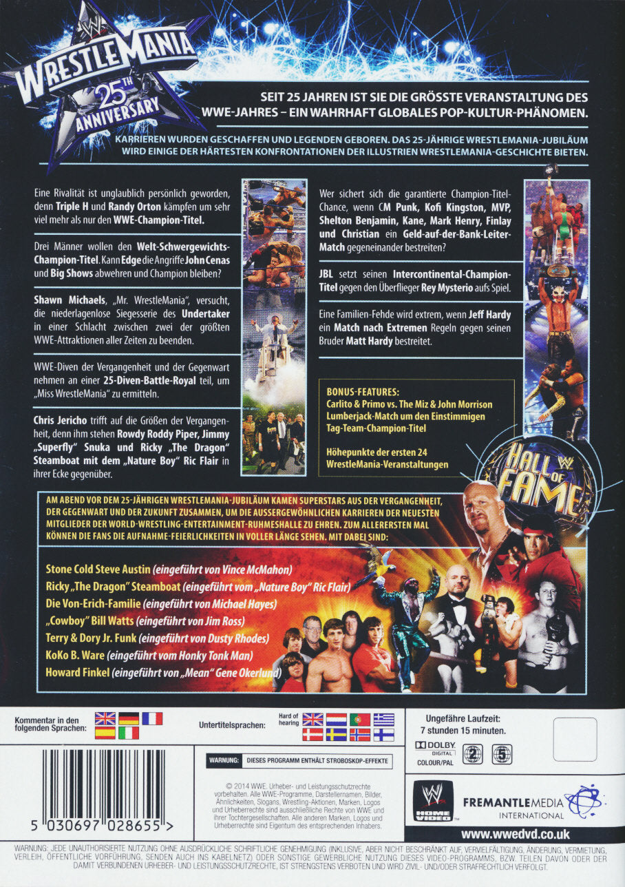 Seit 25 Jahren ist sie die größte Veranstaltung des WWE-Jahres – ein wahrhaft globales Pop-Kultur-Phänomen. Karrieren wurden geschaffen und Legenden geboren. Das 25-jährige WrestleMania-Jubiläum wird einige der härtesten Konfrontationen der illustrien WrestleMania-Geschichte bieten. Eine Rivalität ist unglaublich persönlich geworden, denn Triple H und Randy Orton kämpfen um sehr viel mehr als nur den WWE-Champion-Titel. Drei Männer wollen den Welt-Schwergewichts-Champion-Titel. Kann Edge die Angriffe John Cenas und Big Shows abwehren und Champion bleiben? Shawn Michaels, „Mr. WrestleMania“, versucht, die niederlagenlose Siegesserie des Undertaker in einer Schlacht zwischen zwei der größten WWE-Attraktionen aller Zeiten zu beenden. WWE-Diven der Vergangenheit und der Gegenwart nehmen an einer 25-Diven-Battle-Royal teil, um „Miss WrestleMania“ zu ermitteln. Chris Jericho trifft auf die Größen der Vergangenheit, denn ihm stehen Rowdy Roddy Piper, Jimmy „Superfly“ Snuka und Ricky „The Dragon“ Steamboat mit dem „Nature Boy“ Ric Flair in ihrer Ecke gegenüber. Wer sichert sich die garantierte Champion-Titel-Chance, wenn CM Punk, Kofi Kingston, MVP, Shelton Benjamin, Kane, Mark Henry, Finlay und Christian ein Geld-auf-der-Bank-Leiter-Match gegeneinander bestreiten? JBL setzt seinen Intercontinental-Champion-Titel gegen den Überflieger Rey Mysterio aufs Spiel. Eine Familien-Fehde wird extrem, wenn Jeff Hardy ein Match nach Extremen Regeln gegen seinen Bruder Matt Hardy bestreitet.