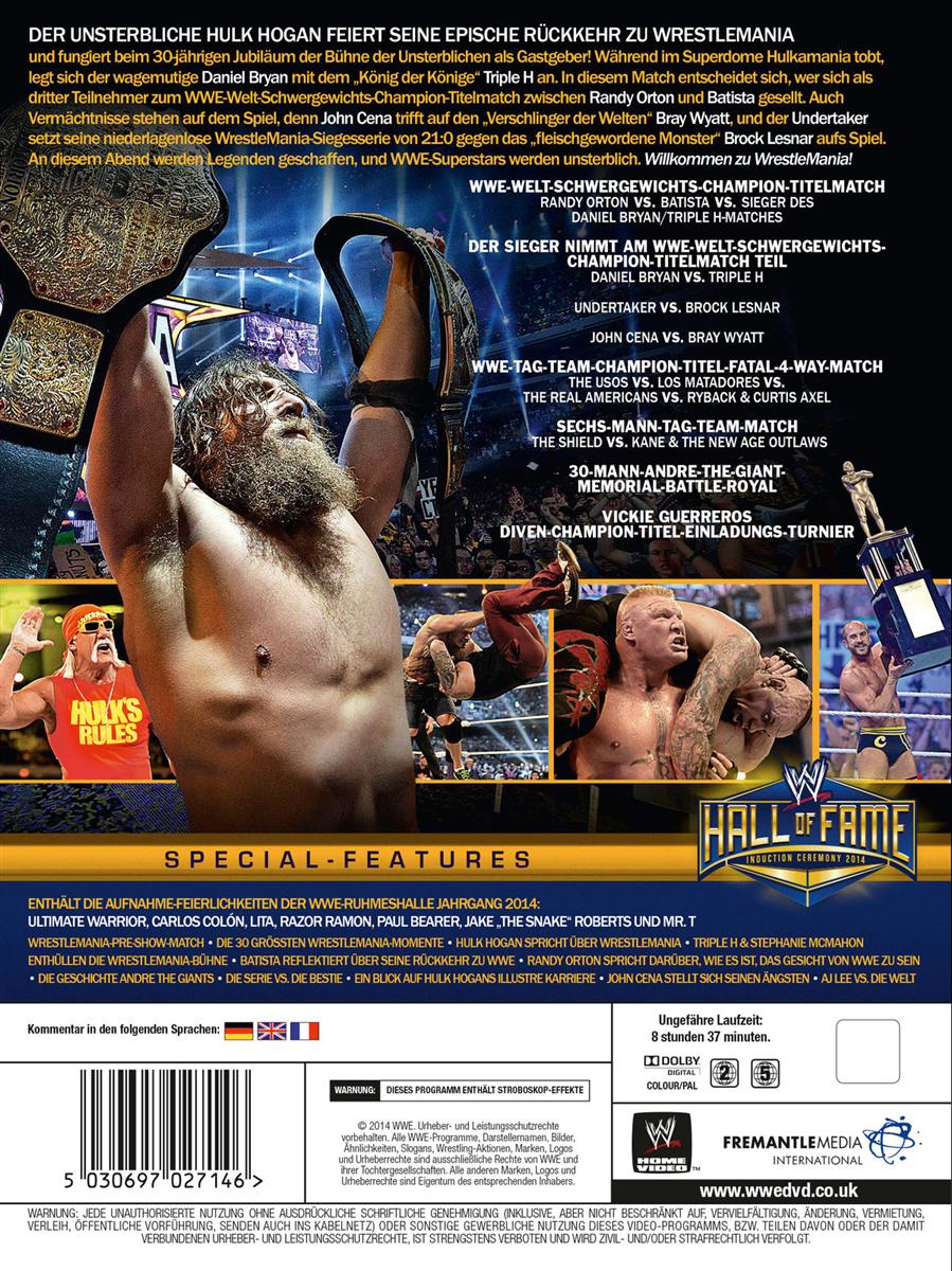 Enthält: ufnahme-Feierlichkeiten der WWE-Ruhmeshalle Jahrgang 2014: Ultimate Warrior, Carlos Colón, Lita, Razor Ramon, Paul Bearer, Jake „The Snake“ Roberts und Mr. T; WrestleMania-Pre-Show-Match * Die 30 größten WrestleMania-Momente; Hulk Hogan spricht über WrestleMania; Triple H & Stephanie McMahon enthüllen die WrestleMania-Bühne; Batista reflektiert über seine Rückkehr zu WWE; Randy Orton spricht darüber, wie es ist, das Gesicht von WWE zu sein; Die Geschichte Andre the Giants; Die Serie vs. Die Bestie; Ein Blick auf Hulk Hogans illustre Karriere; John Cena stellt sich seinen Ängsten; AJ Lee vs. Die Welt; Blu-Ray-Exklusiv-Material;