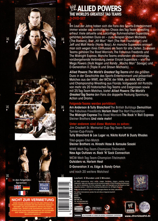 Allied Powers: The World’s Greatest Tag Teams ehrt die größten Duos in der Geschichte des Sports-Entertainment und präsentiert Matches aus der WWE, der WCW, der NWA, der AWA, WCCW und Championship Wrestling aus Florida. Vollgepackt mit Porträts von mehr als 20 historischen Tag-Teams und Ereignissen sowie mit 25 Tag-Team-Matches, bietet Allied Powers: The World’s Greatest Tag Teams den Fans die doppelte Packung Spannung, Action und Drama.
