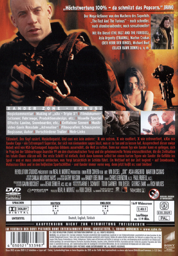 Tätowiert. Den Kopf rasiert. Muskelbepackt. Und cool wie kein anderer: X wie extrem, X wie exaltiert, x wie extrovertiert, xXx wie Xander Cage - ein Extremsport-Superstar, der sich von niemandem sagen läst, was er zu tun und zu lassen hat. Ausgerechnet dieser ewige Rebell wird von NSA-Spitzenagent Augustus Gibbons auserwählt, die Welt zu retten. Denn nur einem Typ wie Xander kann es gelingen, sich in Prag bei der Söldnertruppe Anarchy 99 um den charismatischen Yorgi und die geheimnisvollen Yelena einzuschleichen, die die Zivilisation ins totale Chaos stürzen will. Der erste Schritt ist einfach, doch dann kommen selbst bei einem harten Typen wie Xander die Gefühle ins Spiel - und er muss obendrein entdecken, was Yorgi tatsächlich im Schilde führt. Ein Wettlauf mit der Zeit beginnt - auf Snowboards, Motocross-Bikes und in den heißesten Sportschlitten - und Xander immer vorne weg, denn jetzt heißt es: cool bleiben!