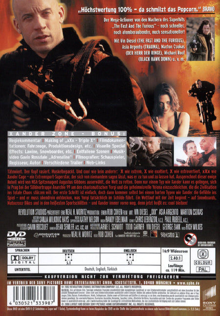 Enthält: Regiekommentar; Making of "xXx - Triple X"; Filmdokumentationen: Fahrzeuge, Produktionsdesign, etc.; Visuelle Special Effects; Lawine, Snowboarder, etc.; Entfallene Szenen; Musik-Video Gavin Rossdale "Adrenaline"; Filmografien: Schauspieler, Regisseur, Autor; Verschiedene Trailer; Web-links;