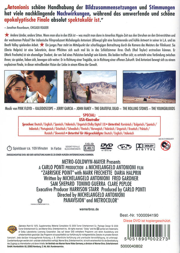Andere Länder, andere Sitten. Wenn man also in den USA ist – was macht man dann in Amerikas Hippie-Zeit aus den Unruhen an den Universitäten und der wachsamen Polizei? Ein junges Paar steht im Mittelpunkt der scharfäugigen Betrachtung durch die Kamera des Meisters der Filmkunst. Sie ist eine Sekretärin, deren Pflichten sich auch mal bis in das Schlafzimmer ihres Chefs erstrecken können. Er ist ein ehemaliger Student, der am Tod eines Polizisten beteiligt sein könnte. Die beiden treffen sich; es entsteht eine Verbindung zwischen ihnen; sie spielen, lieben sich, bewegen sich weiter: Er in Richtung einer Tragödie, sie in Richtung einer offenen Zukunft. Und Antonioni bewegt sich zu einem explosiven Finale, in dieser mitreißenden Vision der Liebe in einem Klima der Gewalt.
